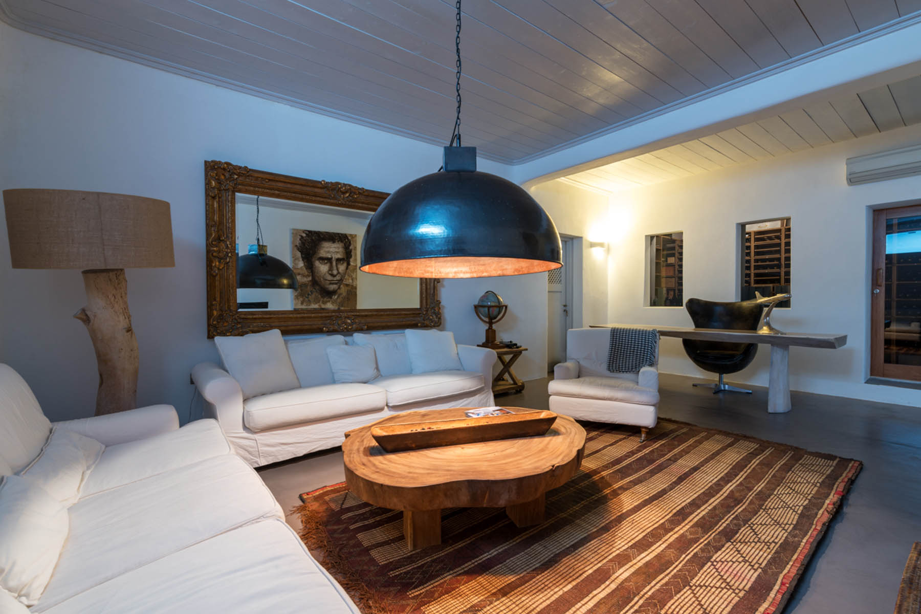 Moving on to the indoors, there is a serenity and a sense of freshness that prevails. A careful designer furniture selection completes the elegance of this house in combination with the Mykonian architecture and bare rock and wooden pieces. The living area as well as the fully equipped open plan kitchen are very inviting for togetherness at any time of the day!