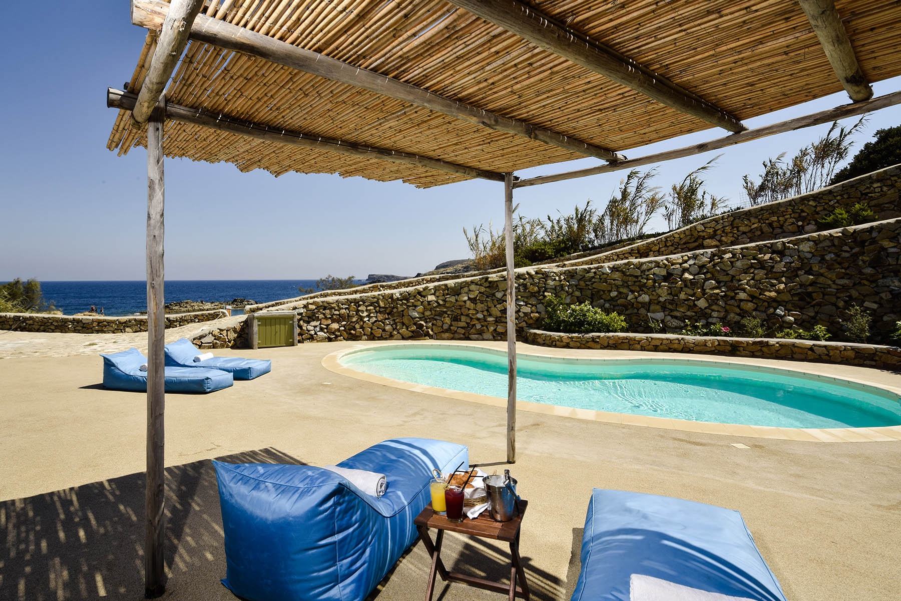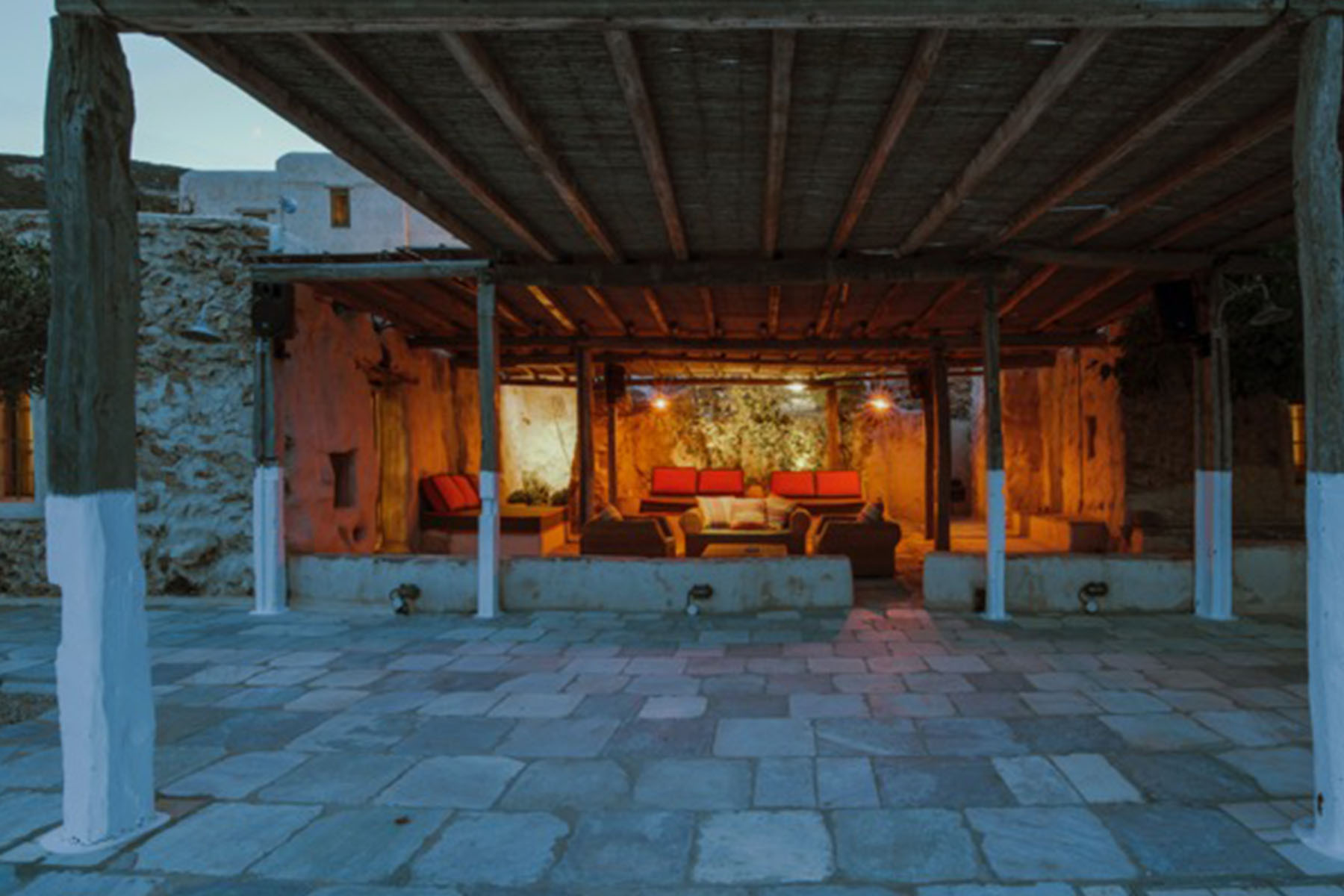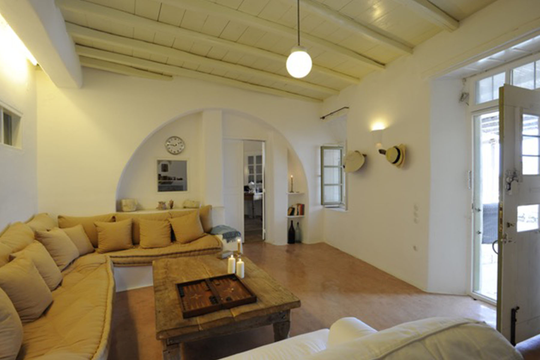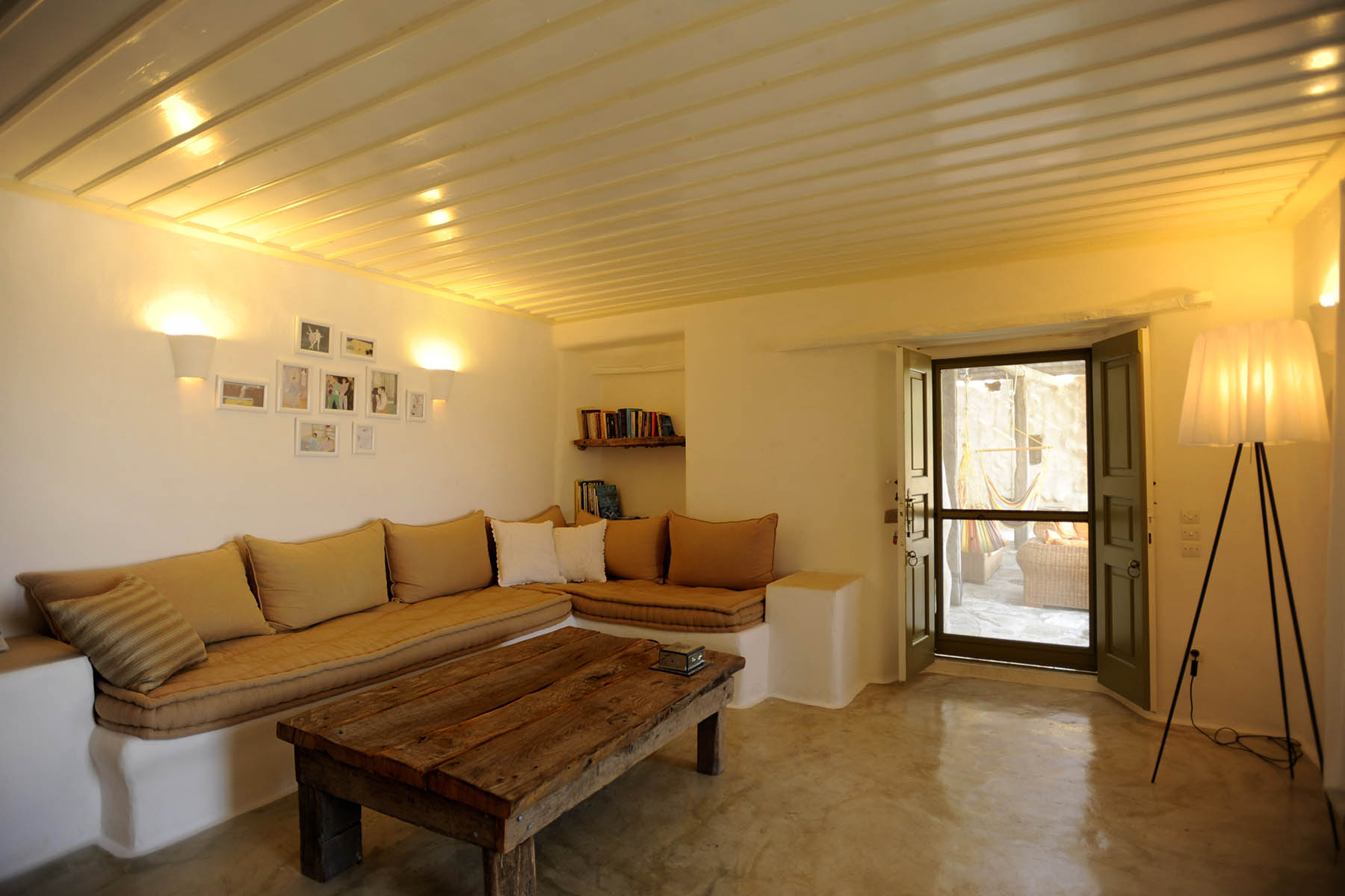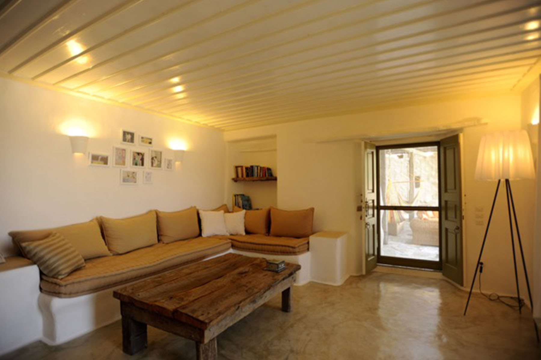 Kalypso is a unique beach house located in one of the most private and secluded areas of Mykonos in Myrsini, next to the beach of Fokos. It is the definition of a seafront villa the highlights of which are this serenity and the privacy it offers. This is not your typical Mykonian house, with huge open spaces, rustic & boho elements and wooden ceilings combined by modern furniture and traditional flooring makes it very original and different. The large outdoor areas are also the perfect setting for a large group of friends or big families. Several lounge areas, with shaded pergolas & spaces as well as a great comfortable hammock are divided in two separate levels. There is also a swimming pool, two large outdoor dining areas that can seat up to 12 guests with the secluded sandy beach only a breath away! The villa, which can accommodate up to 11 Guests, is divided in two units, with the main house and a guesthouse.