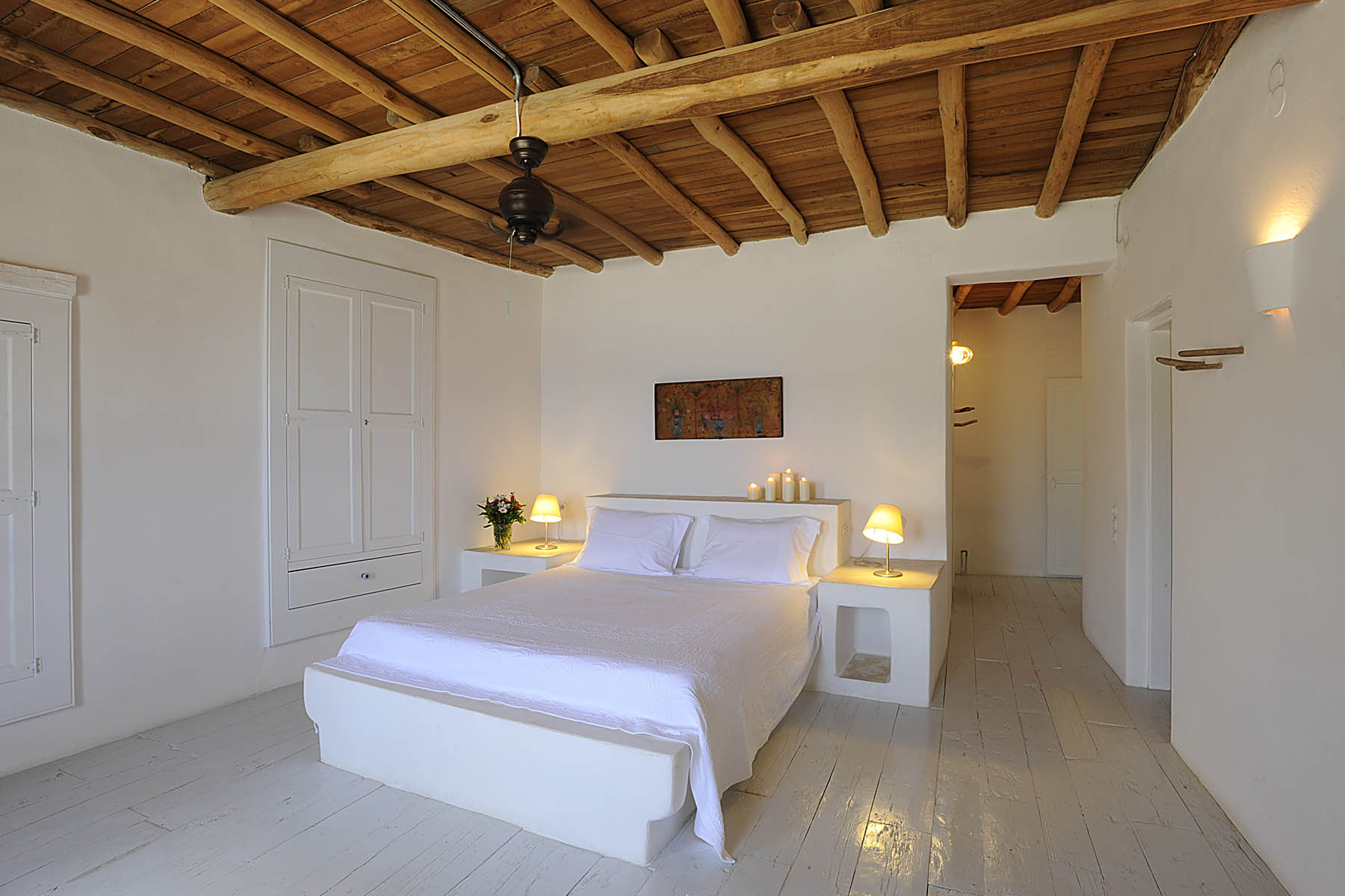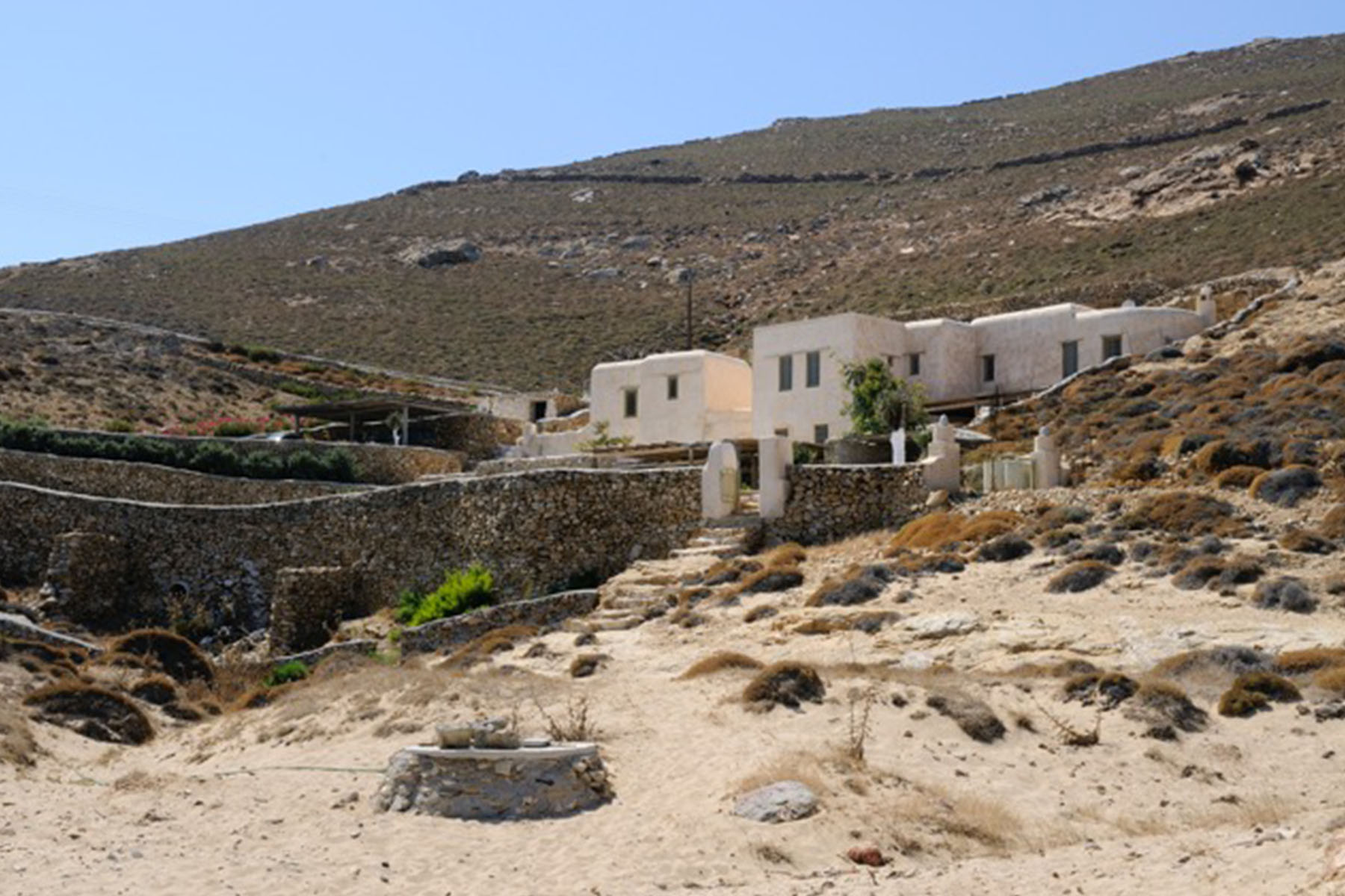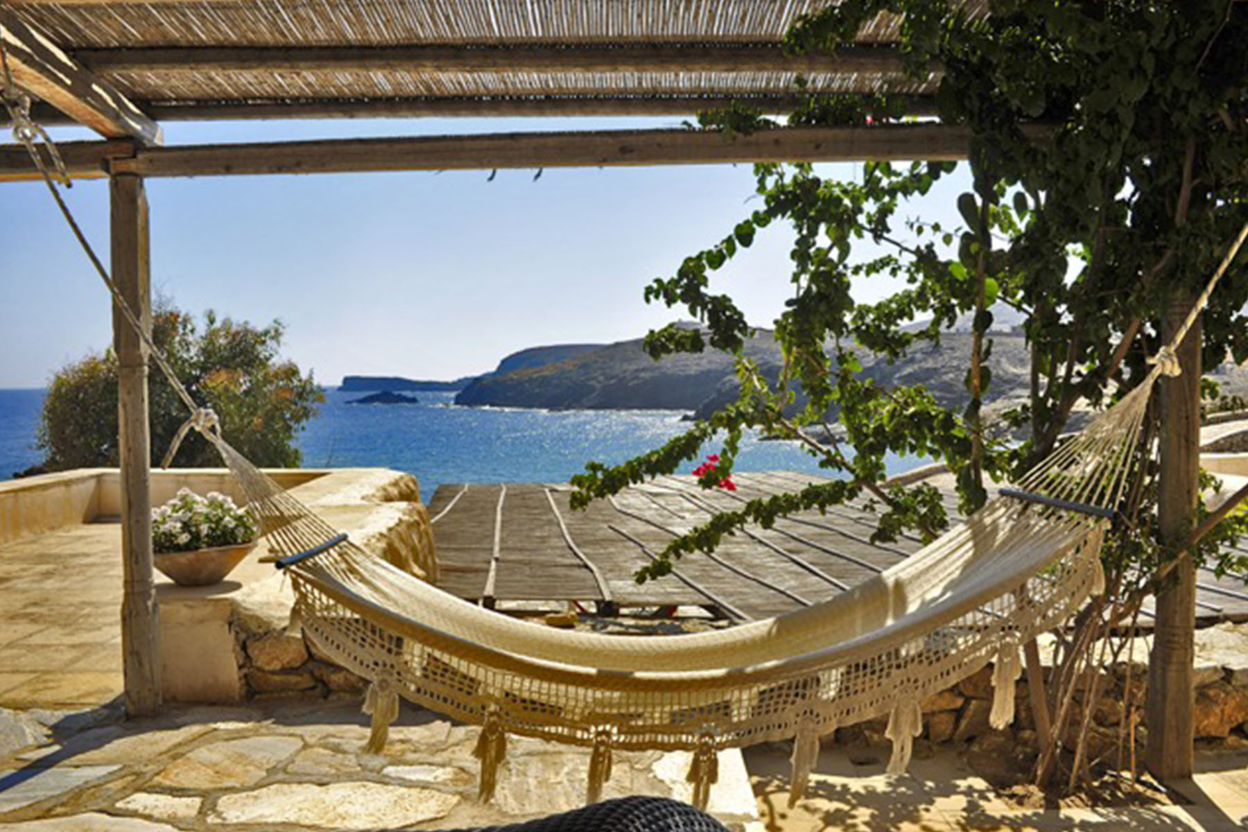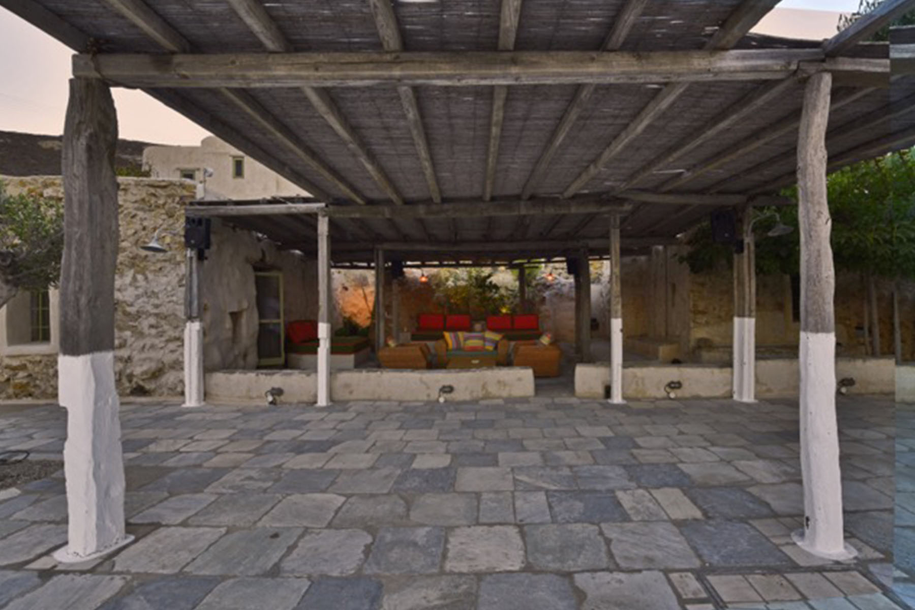 Kalypso is a unique beach house located in one of the most private and secluded areas of Mykonos in Myrsini, next to the beach of Fokos. It is the definition of a seafront villa the highlights of which are this serenity and the privacy it offers. This is not your typical Mykonian house, with huge open spaces, rustic & boho elements and wooden ceilings combined by modern furniture and traditional flooring makes it very original and different. The large outdoor areas are also the perfect setting for a large group of friends or big families. Several lounge areas, with shaded pergolas & spaces as well as a great comfortable hammock are divided in two separate levels. There is also a swimming pool, two large outdoor dining areas that can seat up to 12 guests with the secluded sandy beach only a breath away! The villa, which can accommodate up to 11 Guests, is divided in two units, with the main house and a guesthouse.