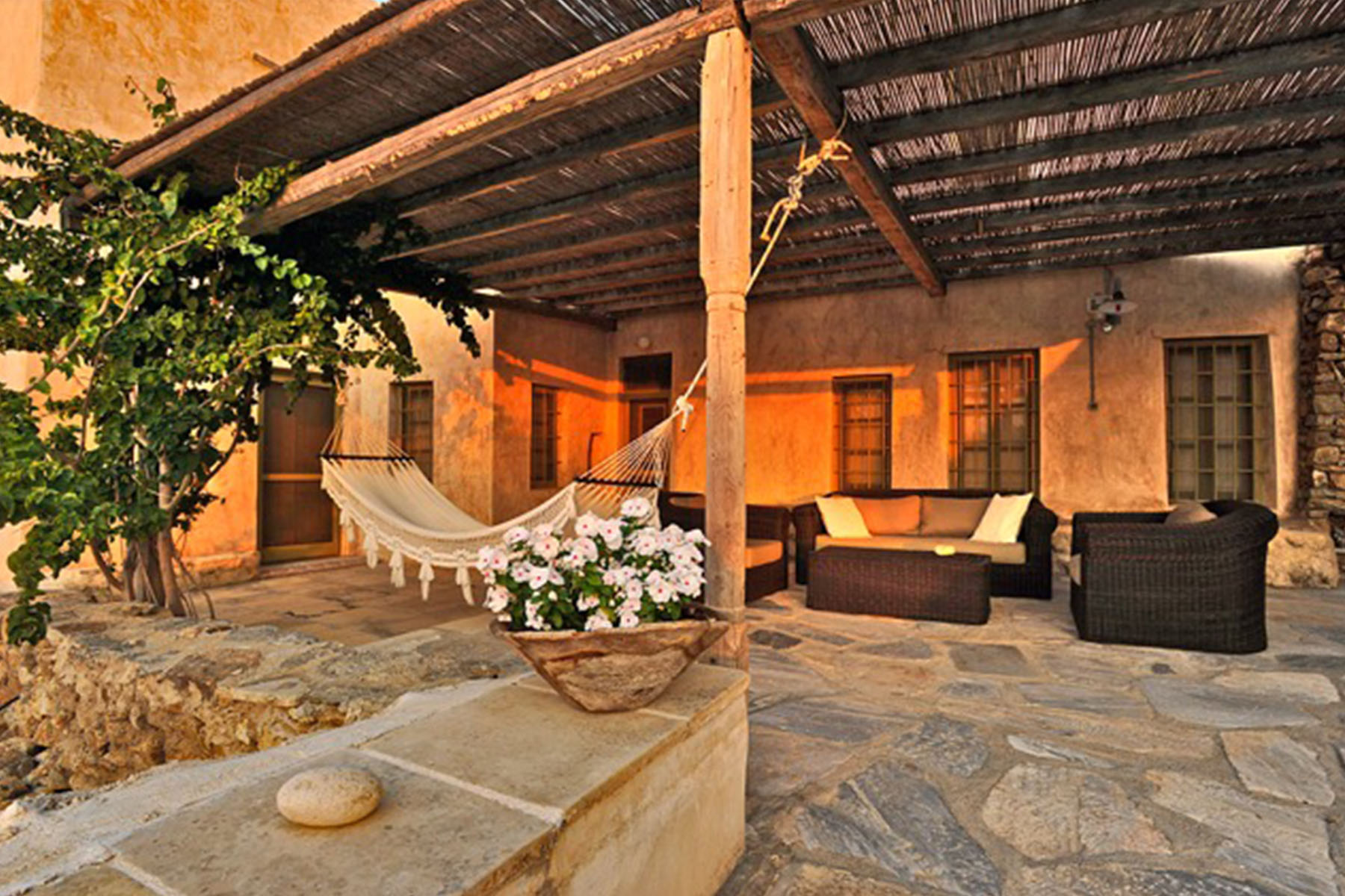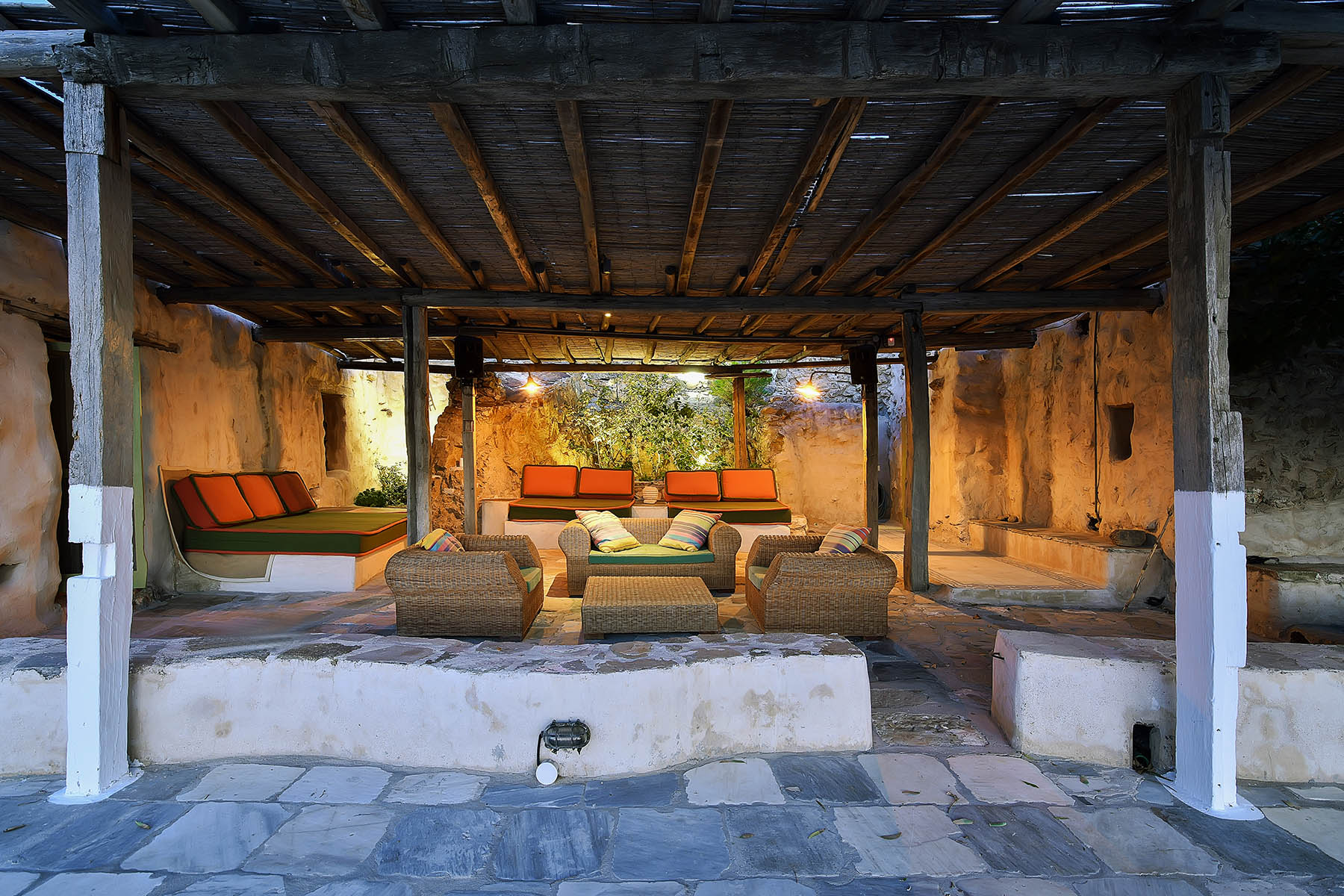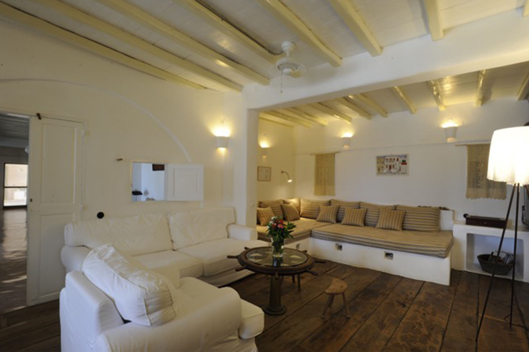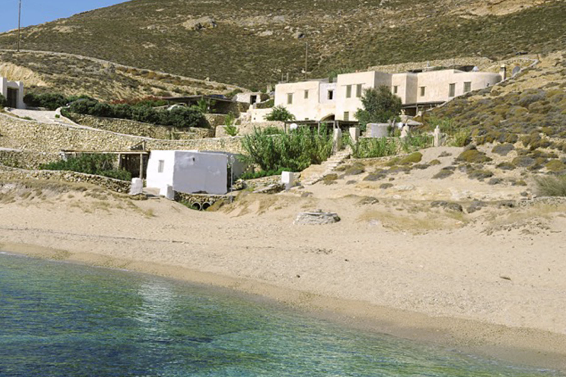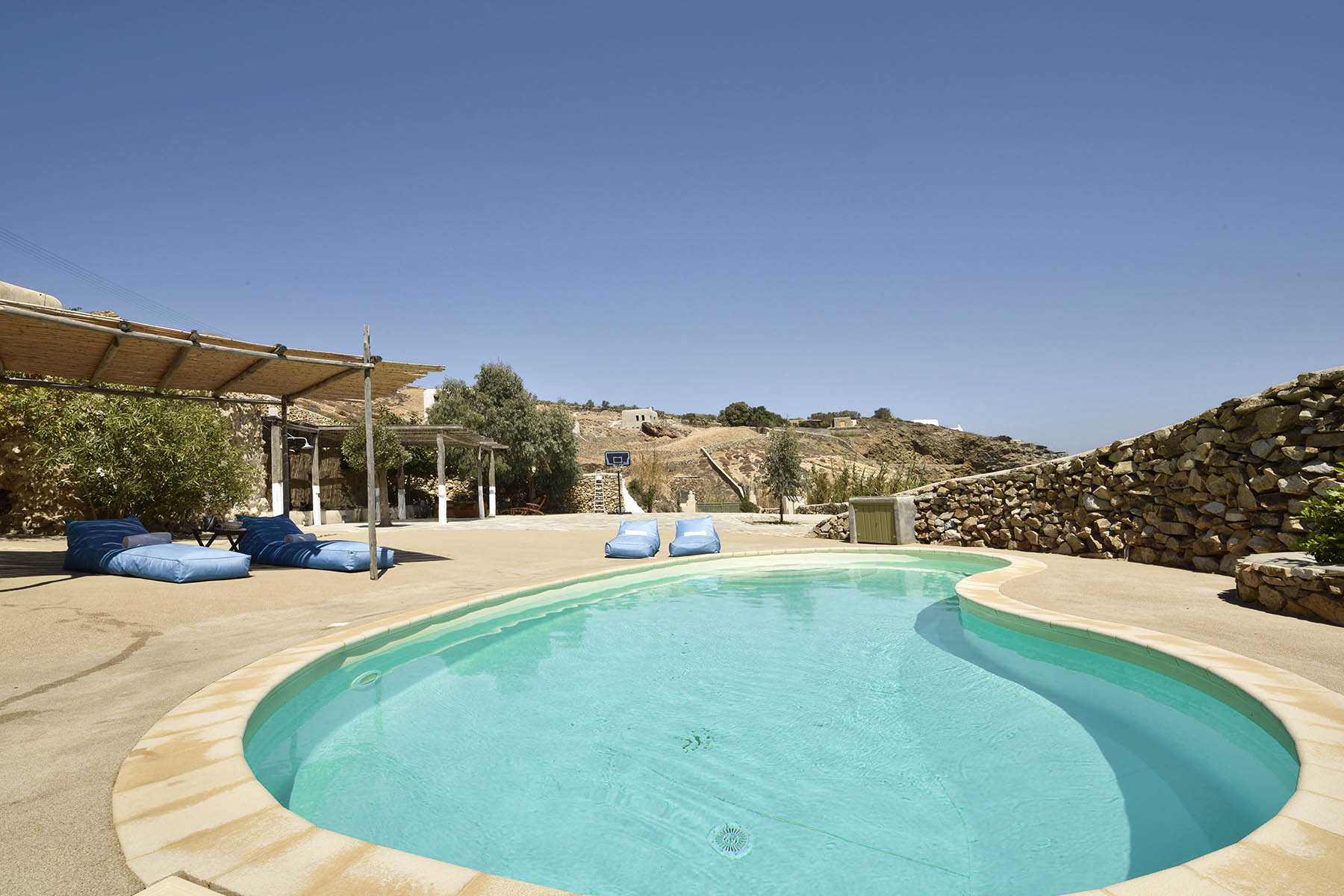 Kalypso is a unique beach house located in one of the most private and secluded areas of Mykonos in Myrsini, next to the beach of Fokos. It is the definition of a seafront villa the highlights of which are this serenity and the privacy it offers. This is not your typical Mykonian house, with huge open spaces, rustic & boho elements and wooden ceilings combined by modern furniture and traditional flooring makes it very original and different. The large outdoor areas are also the perfect setting for a large group of friends or big families. Several lounge areas, with shaded pergolas & spaces as well as a great comfortable hammock are divided in two separate levels. There is also a swimming pool, two large outdoor dining areas that can seat up to 12 guests with the secluded sandy beach only a breath away! The villa, which can accommodate up to 11 Guests, is divided in two units, with the main house and a guesthouse.