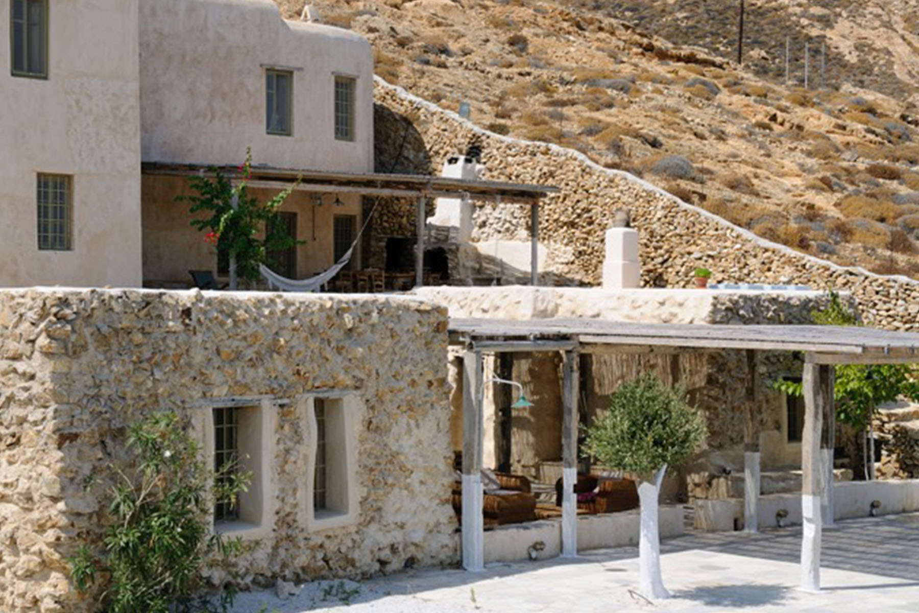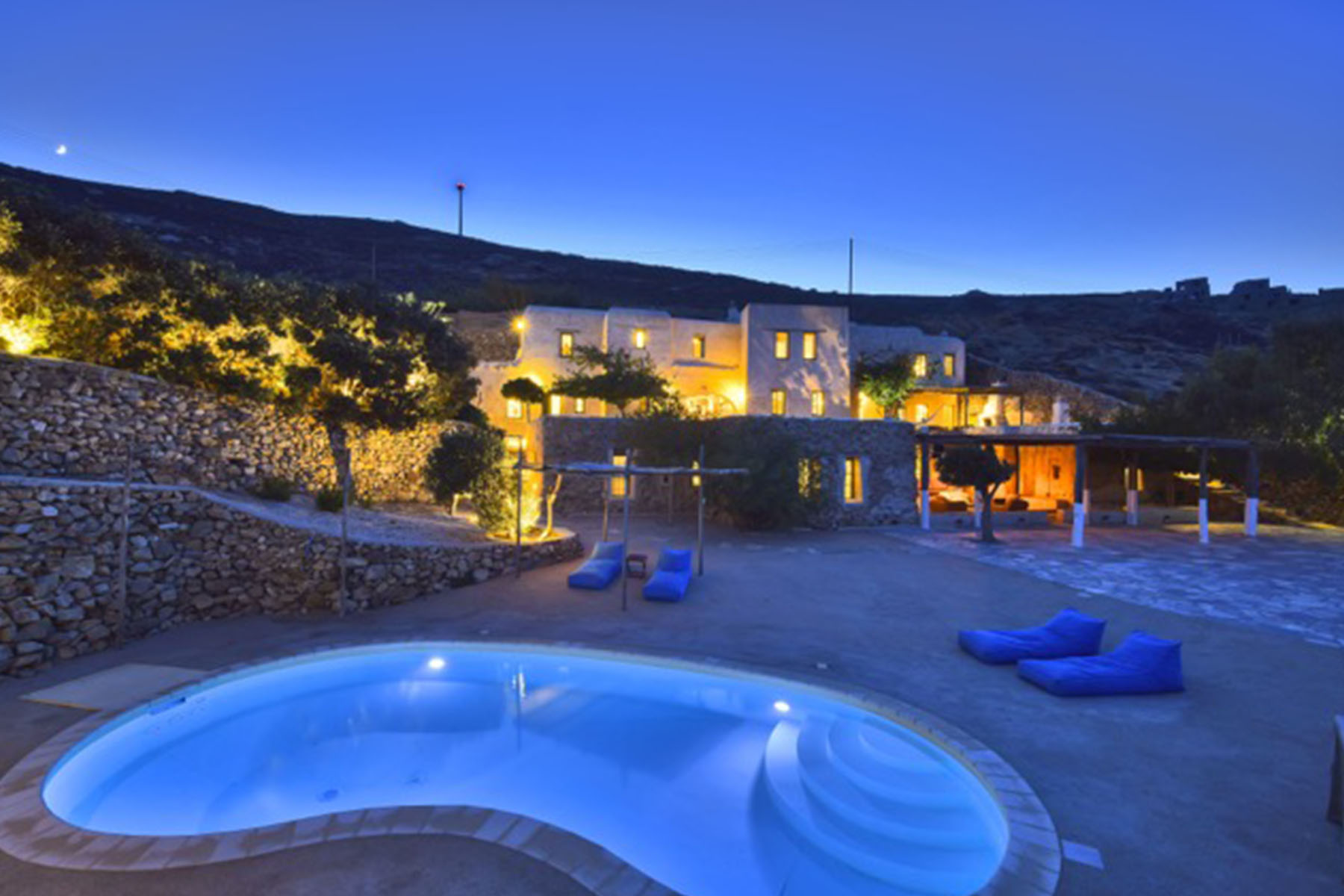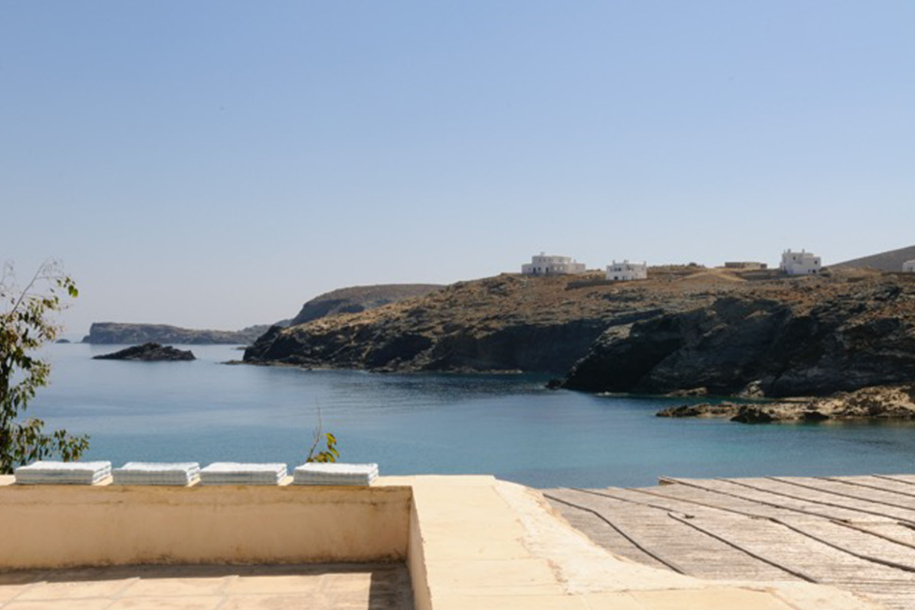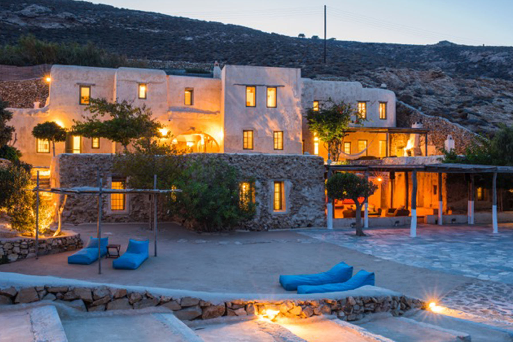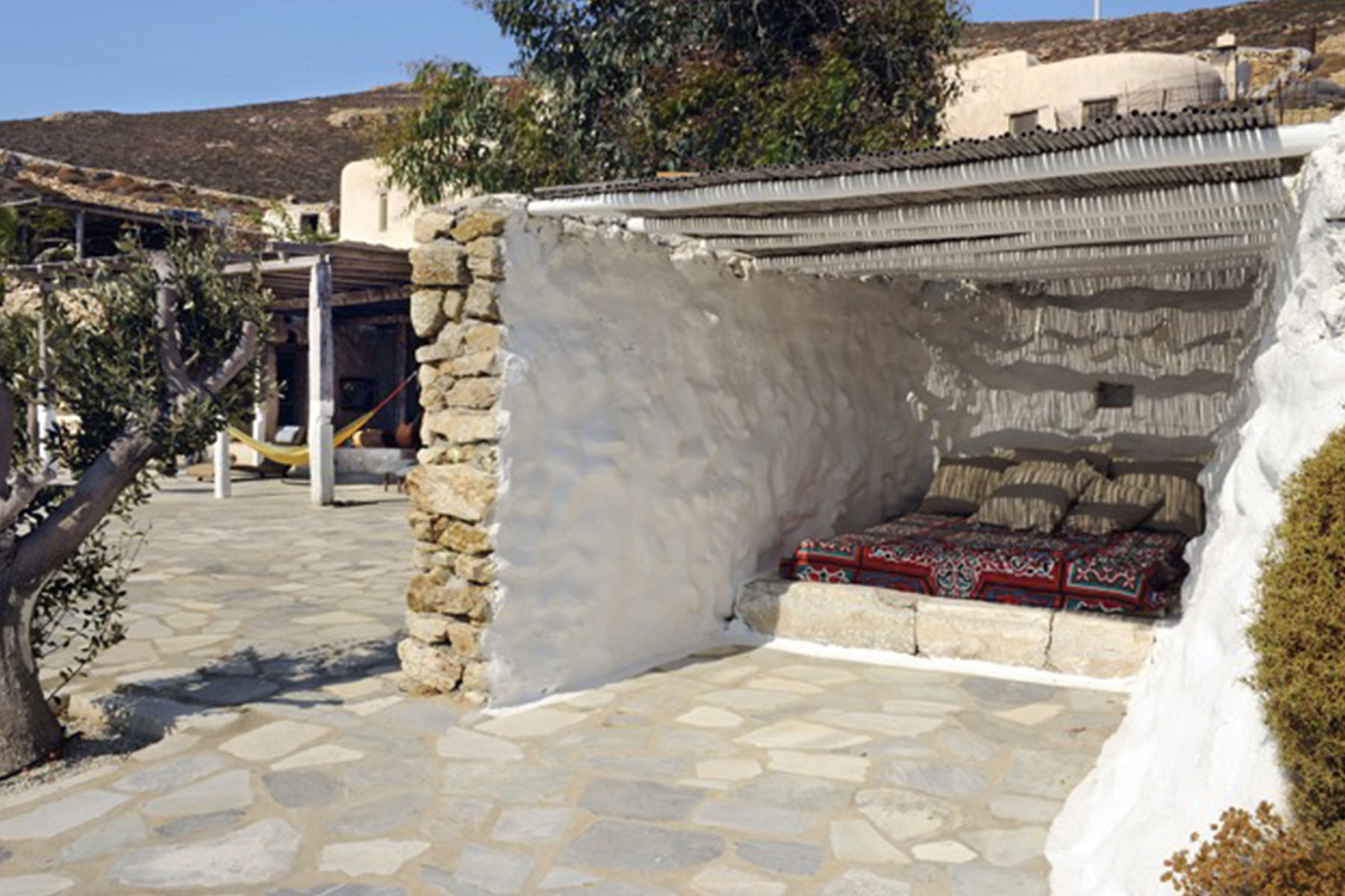 Kalypso is a unique beach house located in one of the most private and secluded areas of Mykonos in Myrsini, next to the beach of Fokos. It is the definition of a seafront villa the highlights of which are this serenity and the privacy it offers. This is not your typical Mykonian house, with huge open spaces, rustic & boho elements and wooden ceilings combined by modern furniture and traditional flooring makes it very original and different. The large outdoor areas are also the perfect setting for a large group of friends or big families. Several lounge areas, with shaded pergolas & spaces as well as a great comfortable hammock are divided in two separate levels. There is also a swimming pool, two large outdoor dining areas that can seat up to 12 guests with the secluded sandy beach only a breath away! The villa, which can accommodate up to 11 Guests, is divided in two units, with the main house and a guesthouse.