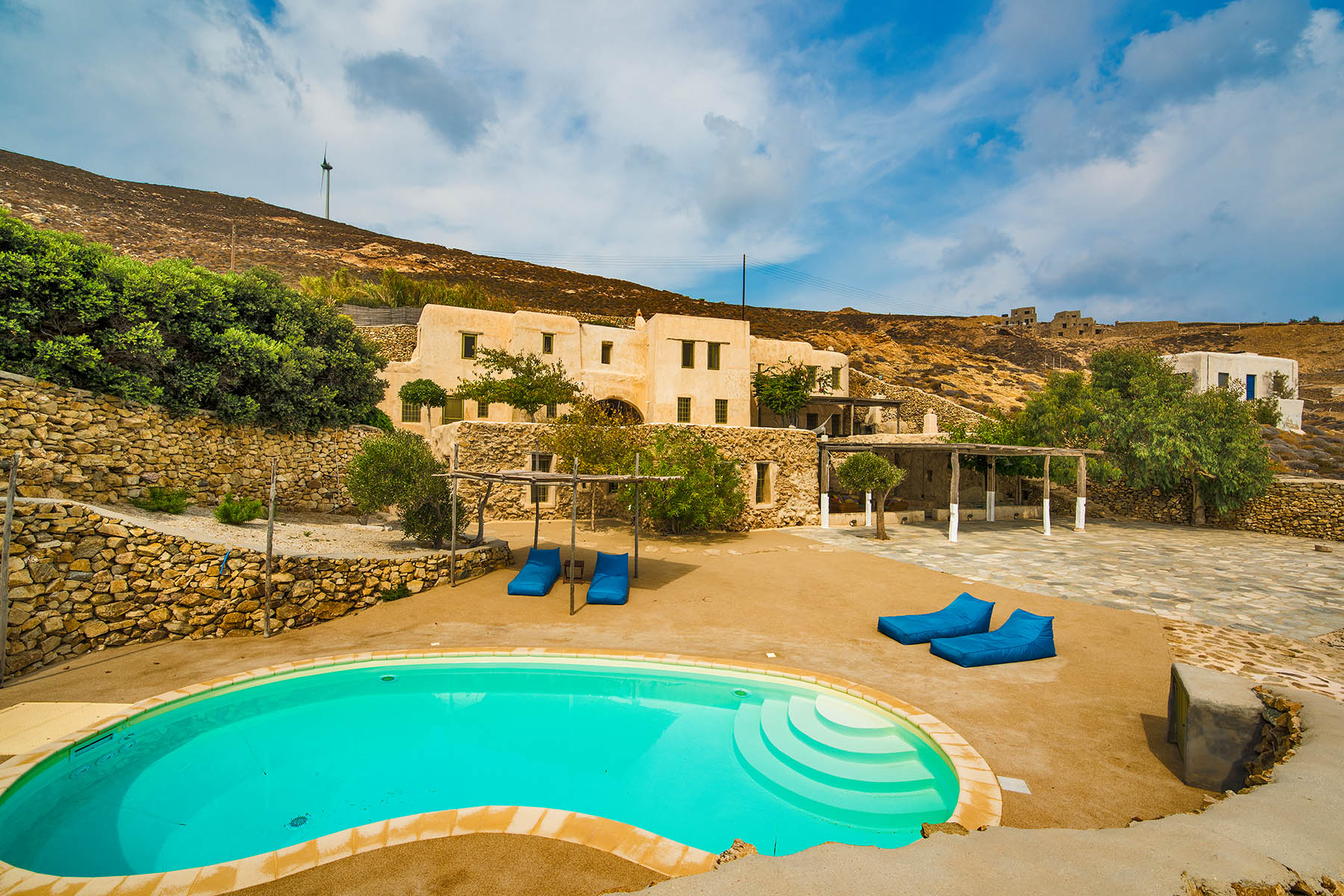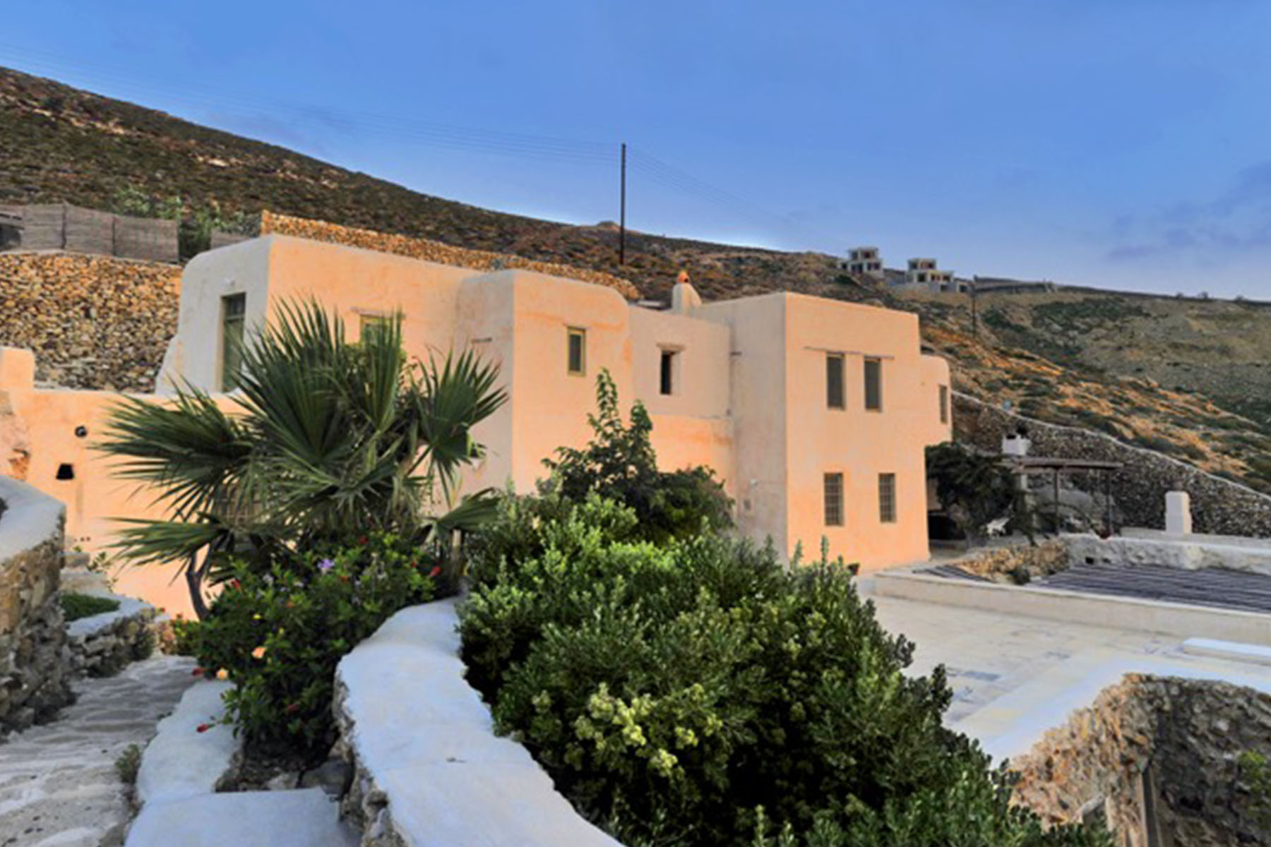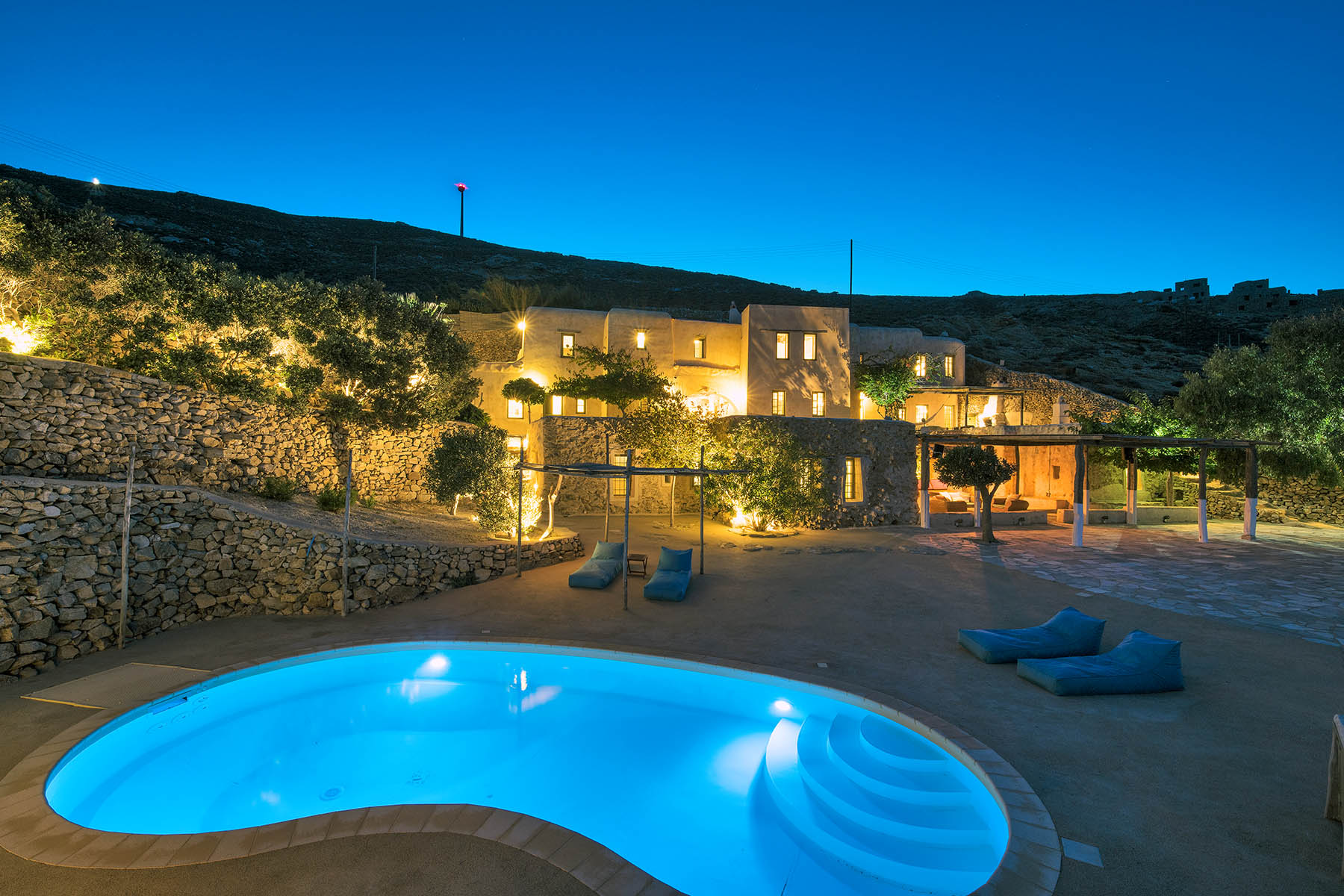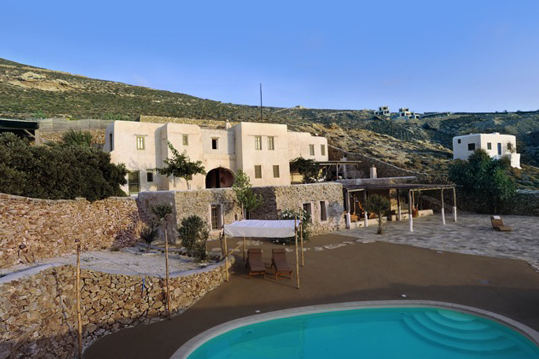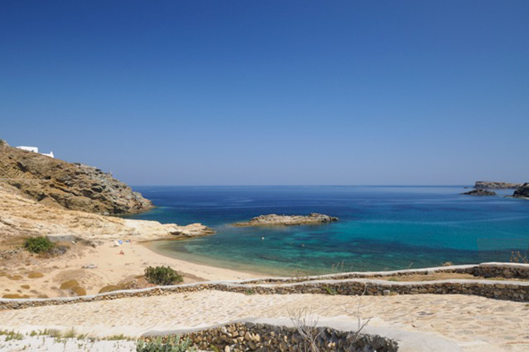 Kalypso is a unique beach house located in one of the most private and secluded areas of Mykonos in Myrsini, next to the beach of Fokos. It is the definition of a seafront villa the highlights of which are this serenity and the privacy it offers. This is not your typical Mykonian house, with huge open spaces, rustic & boho elements and wooden ceilings combined by modern furniture and traditional flooring makes it very original and different. The large outdoor areas are also the perfect setting for a large group of friends or big families. Several lounge areas, with shaded pergolas & spaces as well as a great comfortable hammock are divided in two separate levels. There is also a swimming pool, two large outdoor dining areas that can seat up to 12 guests with the secluded sandy beach only a breath away! The villa, which can accommodate up to 11 Guests, is divided in two units, with the main house and a guesthouse.