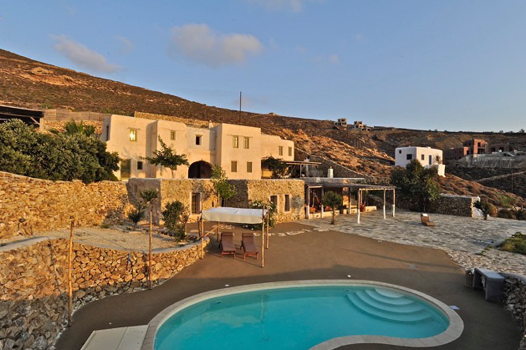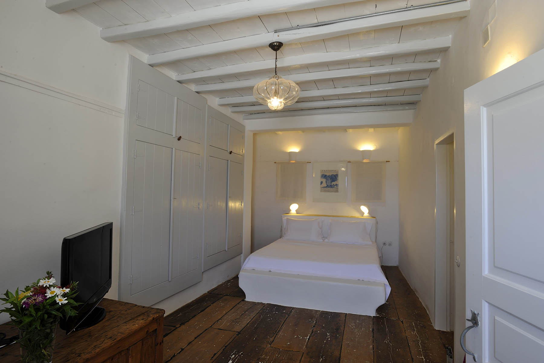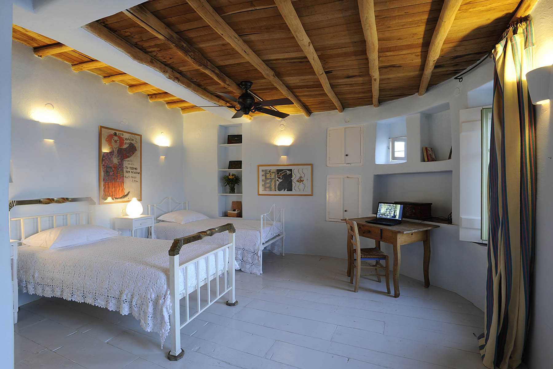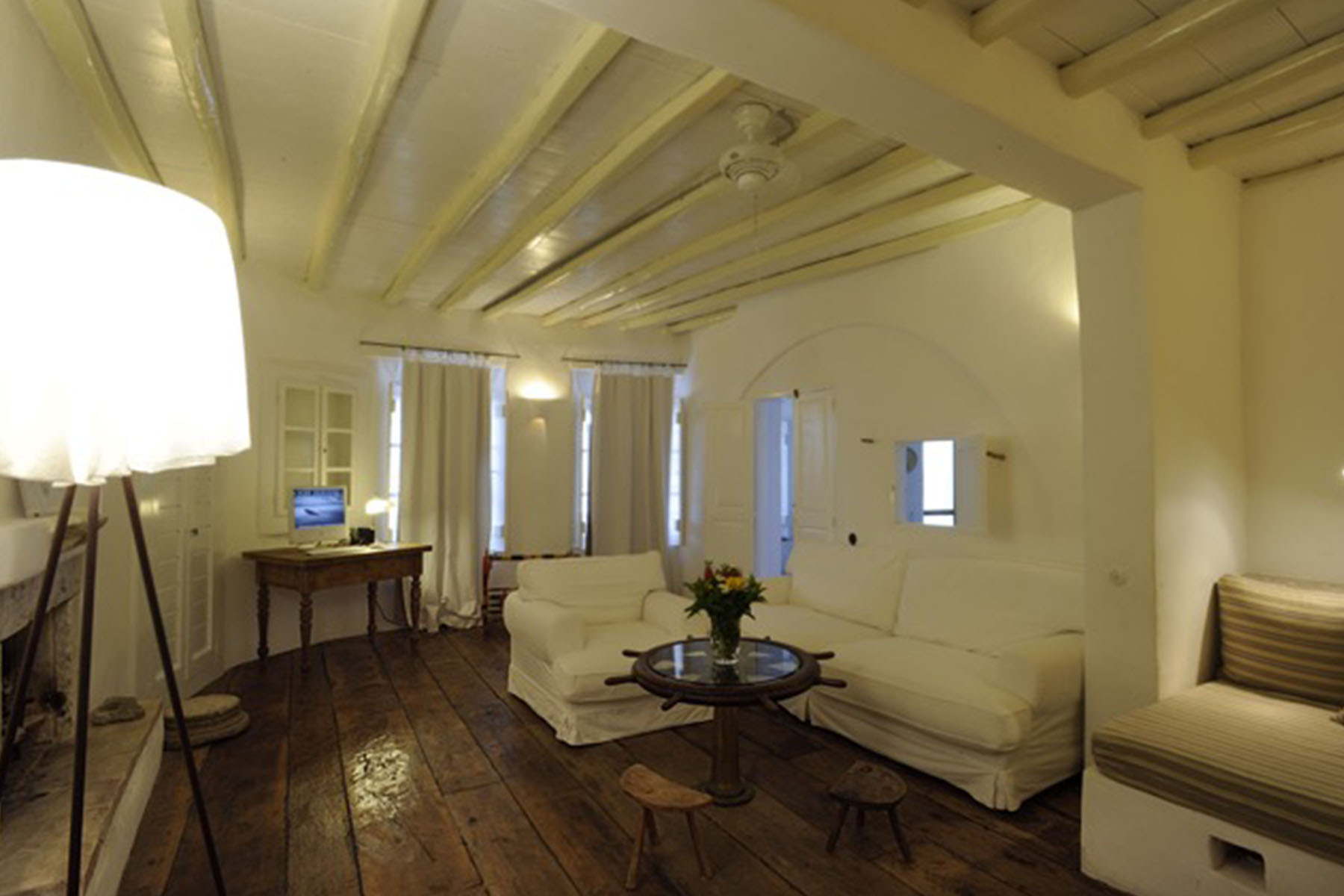 Kalypso is a unique beach house located in one of the most private and secluded areas of Mykonos in Myrsini, next to the beach of Fokos. It is the definition of a seafront villa the highlights of which are this serenity and the privacy it offers. This is not your typical Mykonian house, with huge open spaces, rustic & boho elements and wooden ceilings combined by modern furniture and traditional flooring makes it very original and different. The large outdoor areas are also the perfect setting for a large group of friends or big families. Several lounge areas, with shaded pergolas & spaces as well as a great comfortable hammock are divided in two separate levels. There is also a swimming pool, two large outdoor dining areas that can seat up to 12 guests with the secluded sandy beach only a breath away! The villa, which can accommodate up to 11 Guests, is divided in two units, with the main house and a guesthouse.