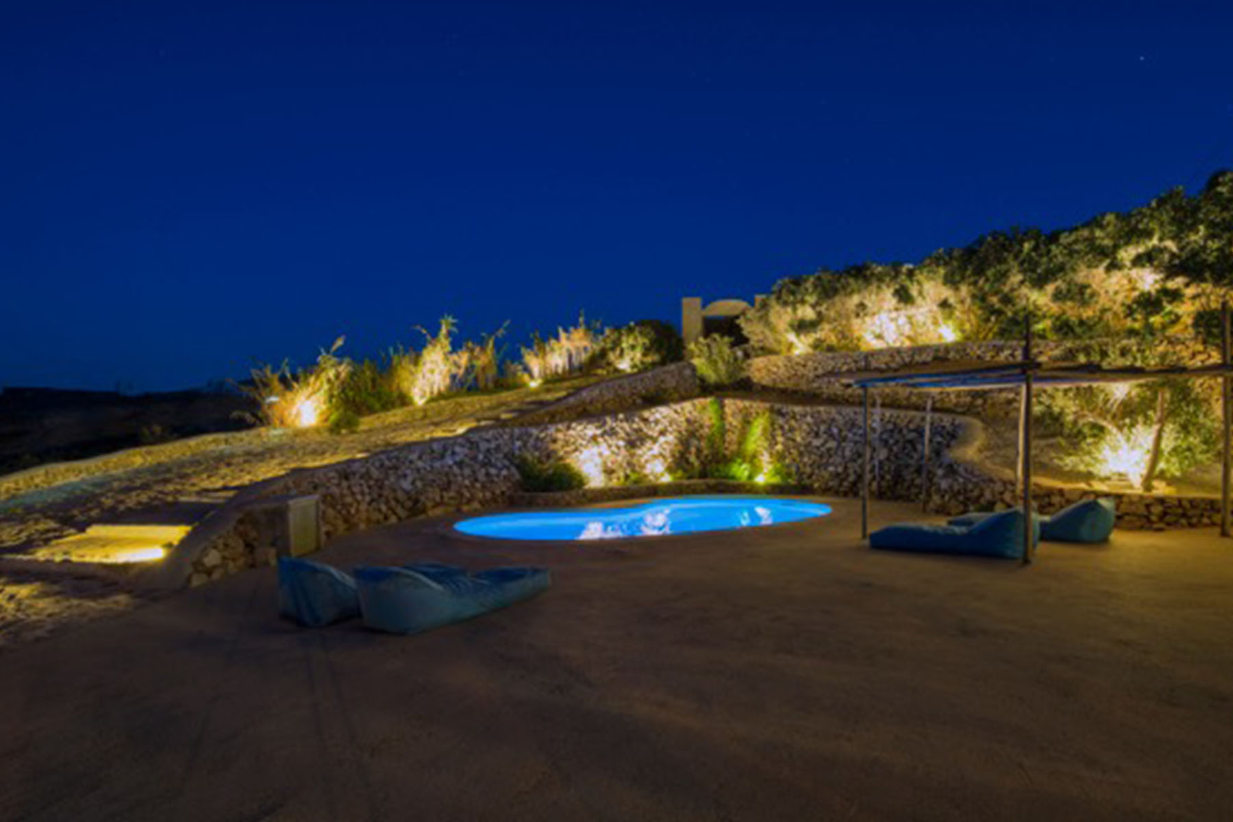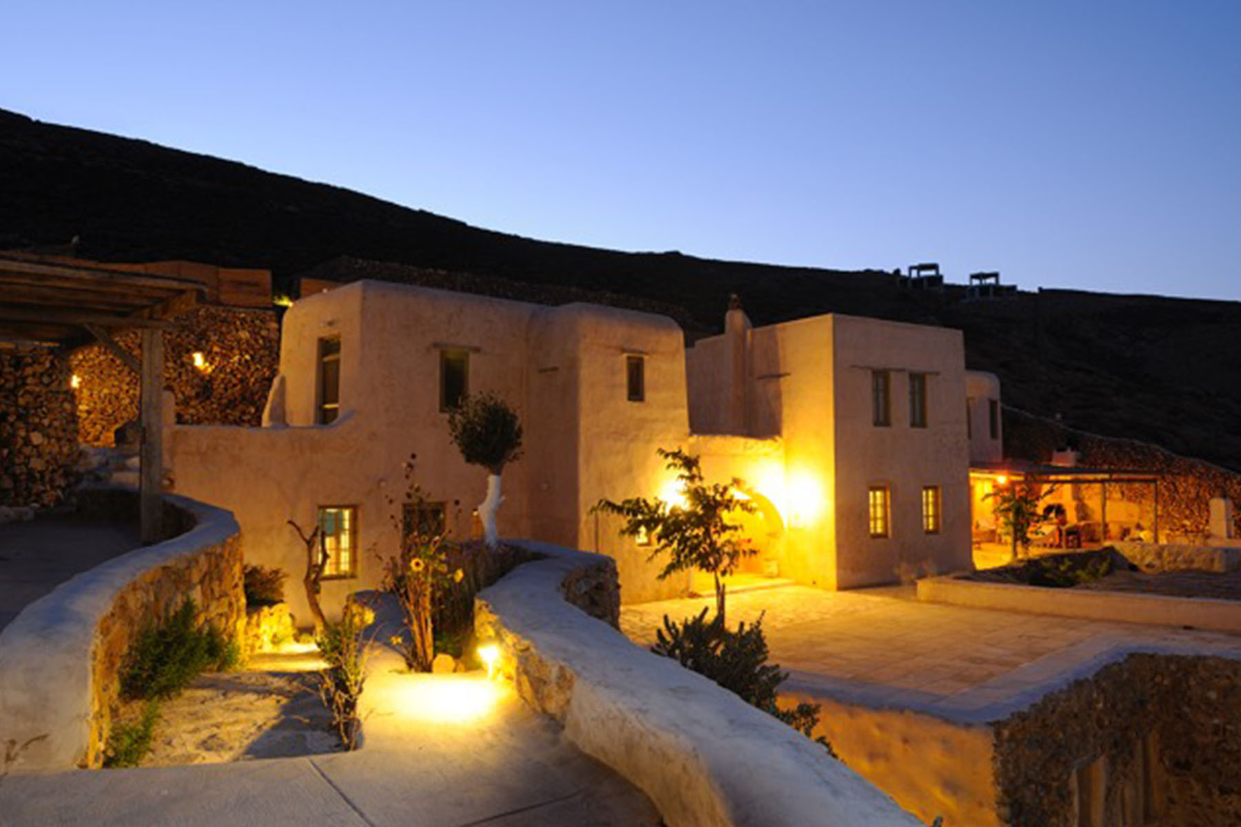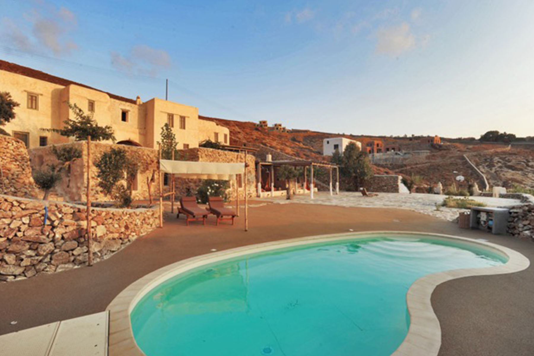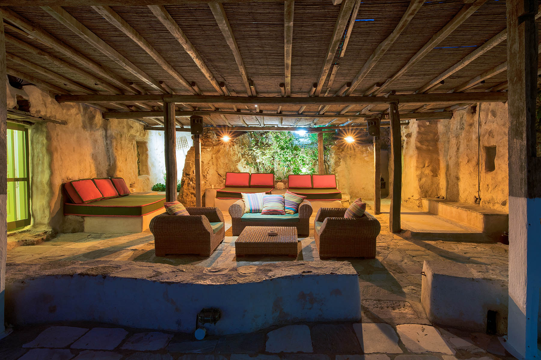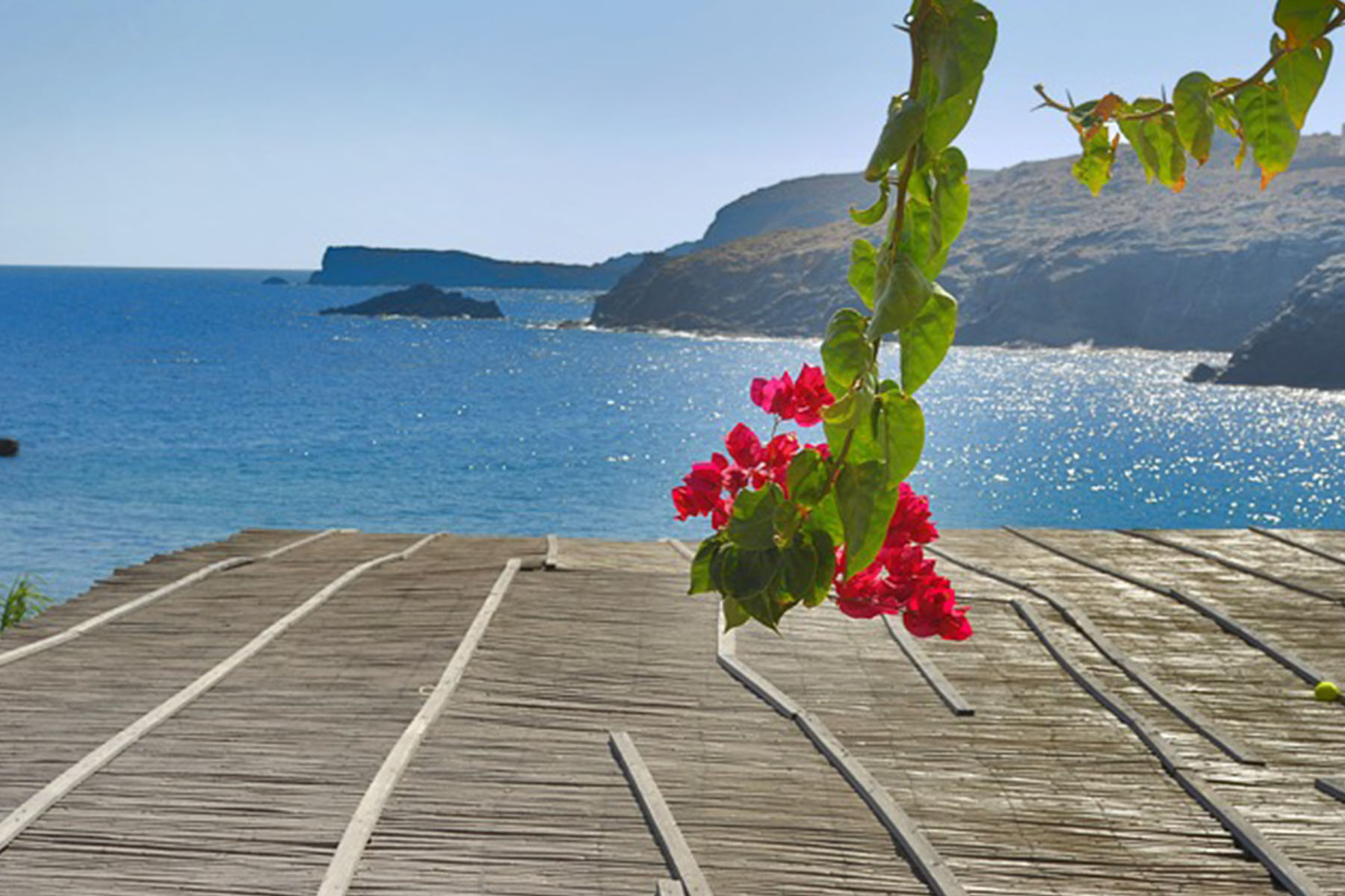 Kalypso is a unique beach house located in one of the most private and secluded areas of Mykonos in Myrsini, next to the beach of Fokos. It is the definition of a seafront villa the highlights of which are this serenity and the privacy it offers. This is not your typical Mykonian house, with huge open spaces, rustic & boho elements and wooden ceilings combined by modern furniture and traditional flooring makes it very original and different. The large outdoor areas are also the perfect setting for a large group of friends or big families. Several lounge areas, with shaded pergolas & spaces as well as a great comfortable hammock are divided in two separate levels. There is also a swimming pool, two large outdoor dining areas that can seat up to 12 guests with the secluded sandy beach only a breath away! The villa, which can accommodate up to 11 Guests, is divided in two units, with the main house and a guesthouse.
