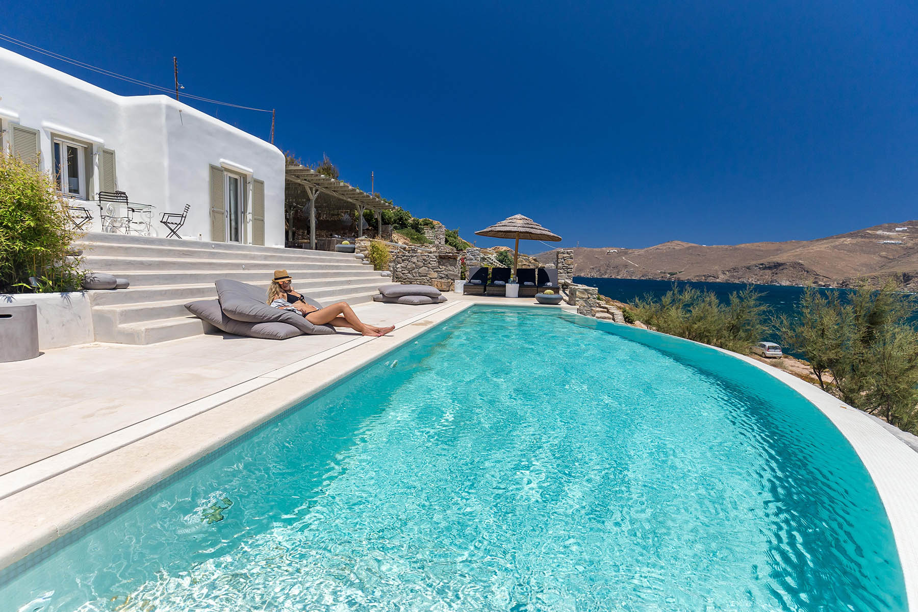 One of MyMykonos favorites, as it is one of the few villas in the entire island that can easily be described as beachfront, only a few steps above the long sandy beach of Ftelia.
