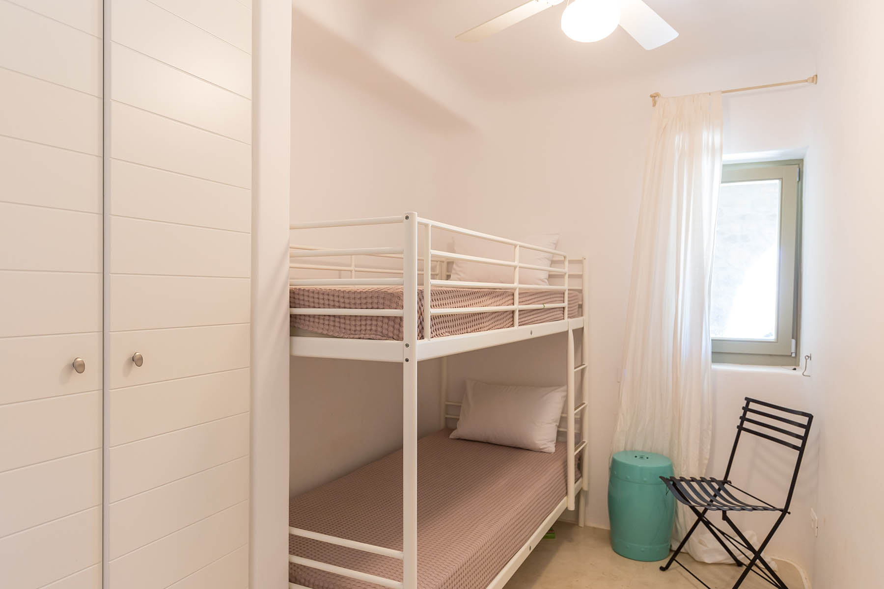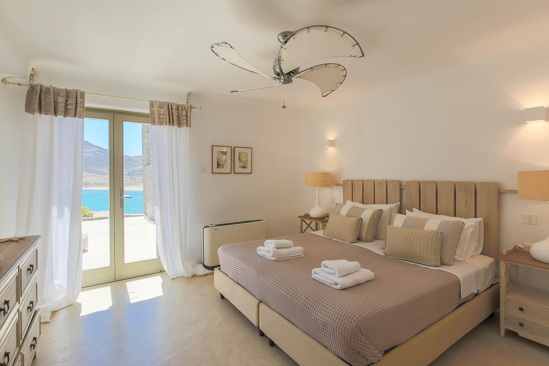 The 5 Bedrooms that comprise this Cycladic villa are divided in two levels: on the upper level you will find the living area, a fully equipped kitchen, 1 Master/Double Bedroom with both A/C & ceiling fan, with sea view & its en-suite bathroom, and 2 Twin Bedrooms with bunk beds with both A/C & ceiling fan & its en-suite bathrooms.