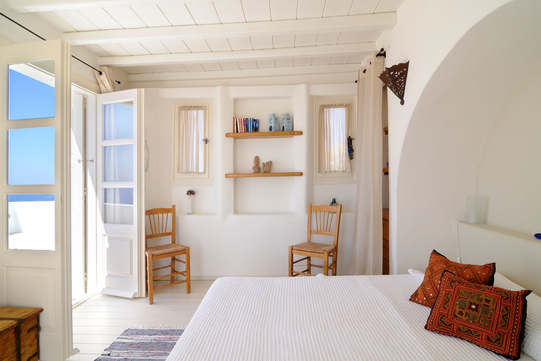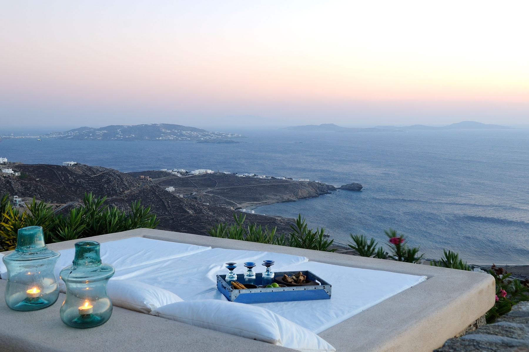 Situated close to the beach of Agios Stefanos and created by a Greek architect and his wife, an interior designer. The dazzling glitter of platter and whitewash of the exterior blends beautifully with the rocky surroundings, while the natural rock has been preserved at some areas as a natural decorative feature. The open and covered terraces offer a stunning view of the town of Mykonos, the sacred island of Delos and the nearby islands.