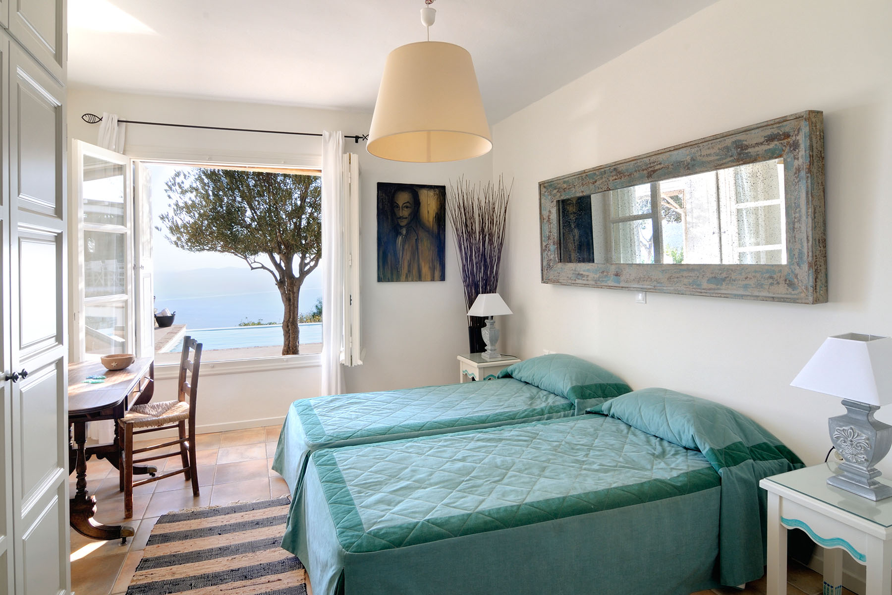 Built on three levels in various cubic volumes, this 6 bedroom holiday villa allows for privacy when desired. The interior is that of a modern house with just enough in the way of traditional style to give it a real character. The owners have taken on a more “theatrical” point of view when they decorated this house, using vivid colors, playful fabrics, artistic objects and paintings, which create an easygoing, relaxing atmosphere. The view is superb. The infinity swimming pool offers an ultimate relaxation spot, as the turquoise waters merge with the cobalt of the sea and highlight the concept of the property, which is to enjoy the fabulous views of Mykonos and its sunsets.